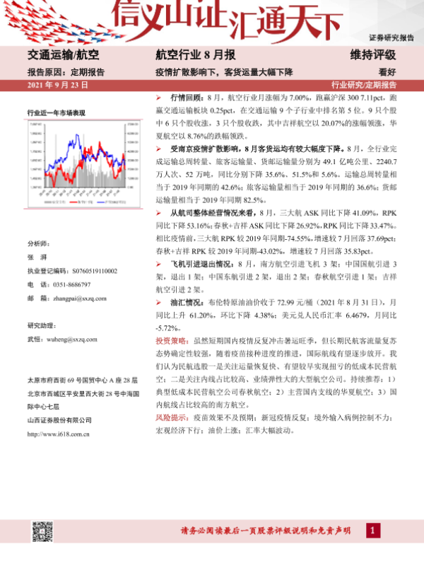 【山西证券】【20210923】航空行业8月报:疫情扩散影响下,客货运量大幅下降-12页 行业研究