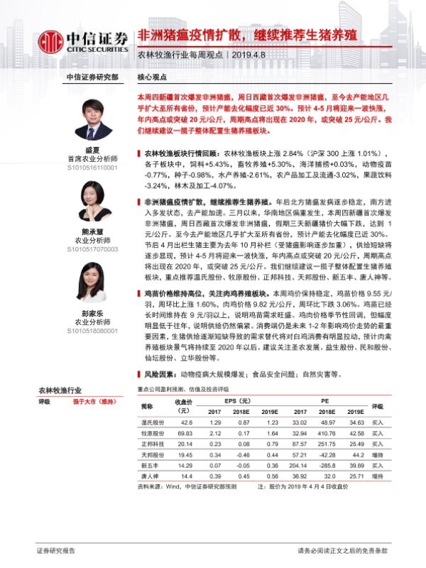【中信证券】【20190408】20190408-中信证券-农林牧渔行业每周观点:非洲猪瘟疫情扩散,继续推荐生猪养殖-6页 行业研究