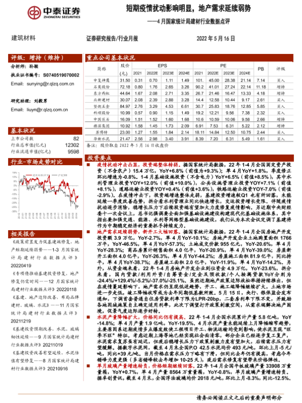 【中泰证券】【20220516】4月国家统计局建材行业数据点评:短期疫情扰动影响明显,地产需求延续弱势-6页 行业研究