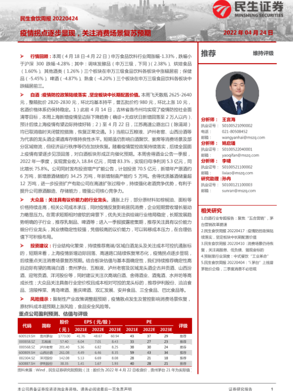 【民生证券】【20220424】食饮行业周报:疫情拐点逐步显现,关注消费场景复苏预期-11页 行业研究