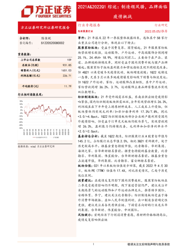 【方正证券】【20220505】纺织服装行业2021A&2022Q1综述:制造领风骚,品牌面临疫情挑战-26页 行业研究
