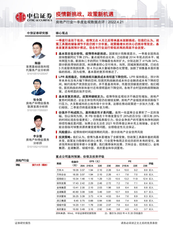 【中信证券】【20220421】房地产行业一季度宏观数据点评:疫情新挑战,政策新机遇-20页 行业研究