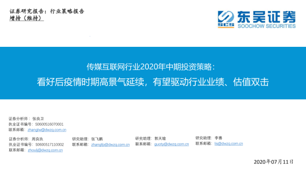 【东吴证券】【20200711】传媒互联网行业2020年中期投资策略:看好后疫情时期高景气延续,有望驱动行业业绩、估值双击-72页 行业研究