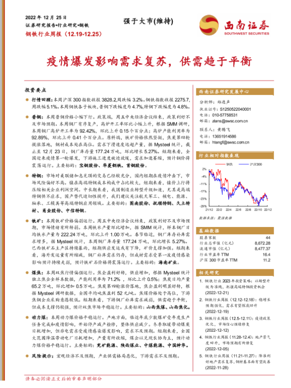 【西南证券】【20221225】钢铁行业周报:疫情爆发影响需求复苏,供需趋于平衡-16页 行业研究