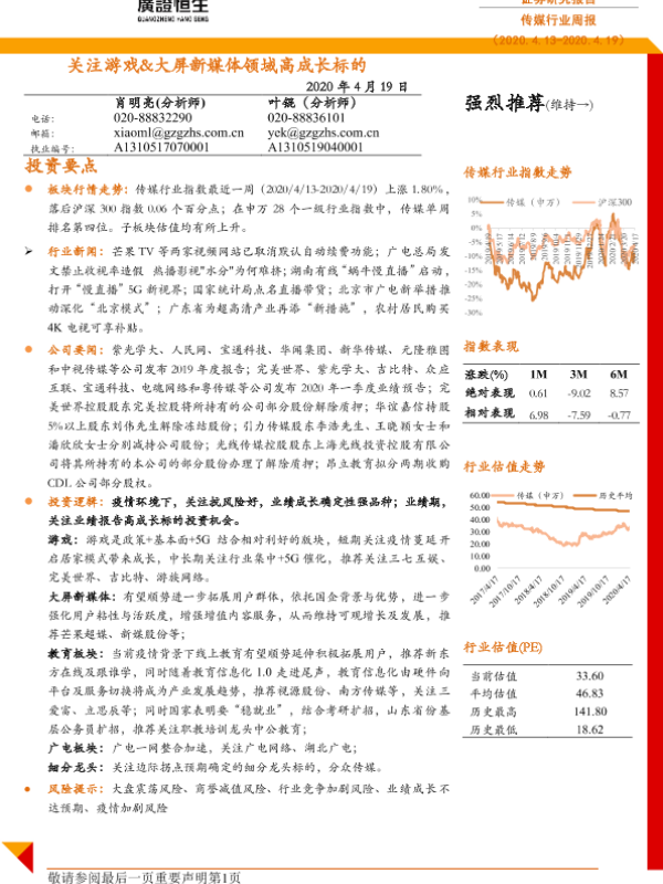【广证恒生】【20200419】传媒行业周报:关注游戏&大屏新媒体领域高成长标的-17页 行业研究