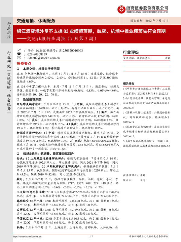 【浙商证券】【20220717】交运社服行业周报:锦江酒店境外复苏支撑Q2业绩超预期,航空、机场中报业绩预告符合预期-17页 行业研究