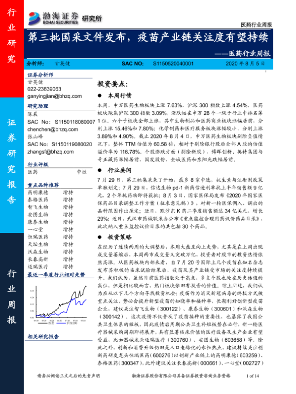 【渤海证券】【20200805】第三批国采文件发布,疫苗产业链关注度有望持续-14页 行业研究