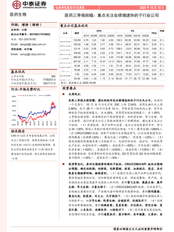 【中泰证券】【20201010】医药三季报前瞻:重点关注业绩增速快的子行业公司-10页 行业研究