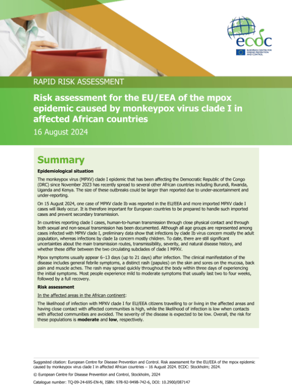 【European Centre for Disease Prevention and Control】【20240816】Risk assessment for the EU/EEA of the mpox epidemic caused by monkeypox virus clade I in affected African countries-13页 行业研究