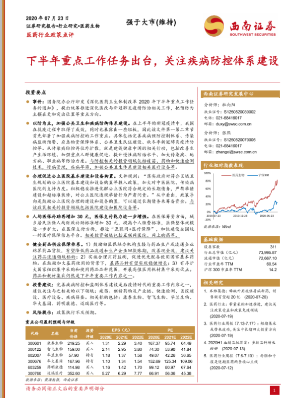 【西南证券】【20200723】医药行业政策点评:下半年重点工作任务出台,关注疾病防控体系建设-8页 行业研究