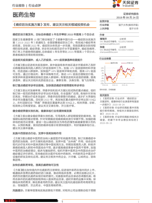 【天风证券】【20190924】癌症防治实施方案发布,建议关注相关领域投资机会-6页 行业研究