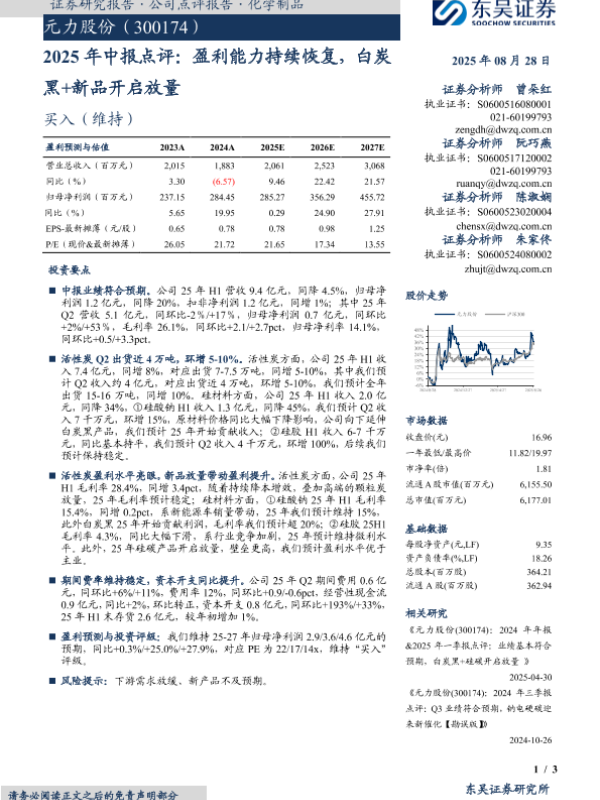 【东吴证券】【20250828】元力股份-2025年中报点评:盈利能力持续恢复,白炭黑+新品开启放量-3页 证券期货研究报告