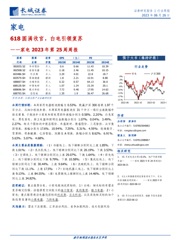 【长城证券】【20230626】家电2023年第25周周报:618圆满收官,白电引领复苏-30页 行业研究