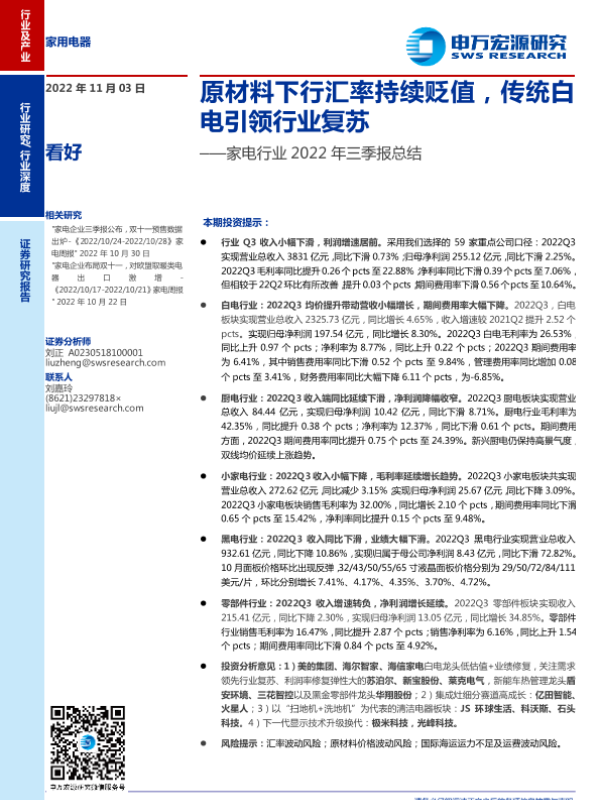 【申万宏源】【20221103】家电行业2022年三季报总结:原材料下行汇率持续贬值,传统白电引领行业复苏-28页 行业研究