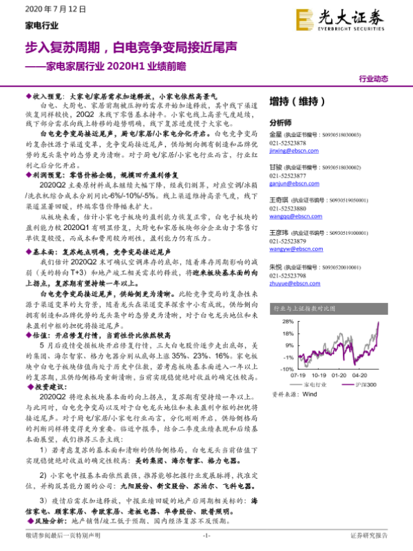 【光大证券】【20200712】家电家居行业2020H1业绩前瞻:步入复苏周期,白电竞争变局接近尾声-27页 行业研究