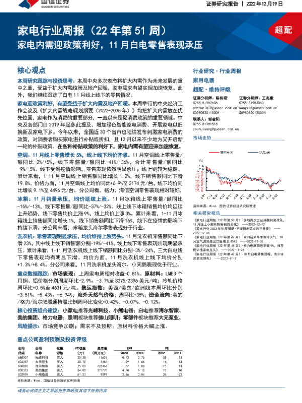 【国信证券】【20221219】家电行业周报(22年第51周):家电内需迎政策利好,11月白电零售表现承压-18页 行业研究