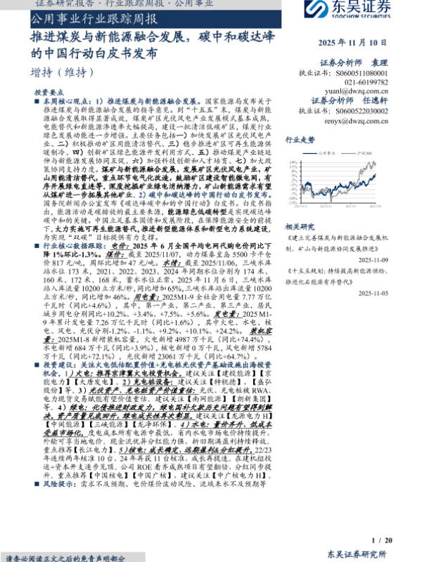【东吴证券】【202511】推进煤炭与新能源融合发展,碳中和碳达峰的中国行动白皮书发布-20页 证券期货研究报告