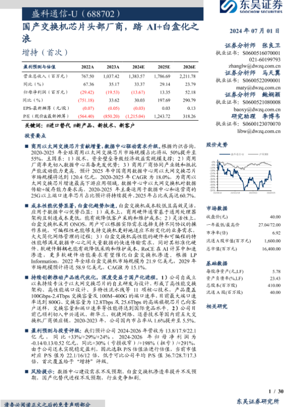 【东吴证券】【20240701】盛科通信-U(688702)国产交换机芯片头部厂商,踏AI+白盒化之浪-30页 行业研究