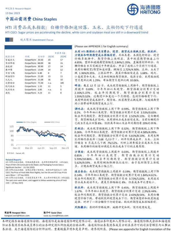 【海通国际】【20231213】中国必需消费:HTI消费品成本指数:白糖价格加速回落,玉米、豆粕仍处下行通道-16页 行业研究