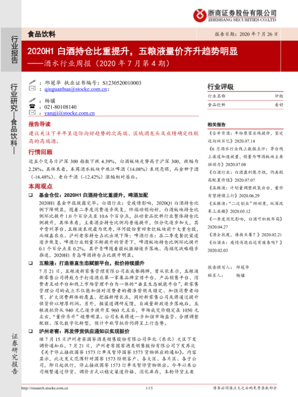 【浙商证券】【20200726】2020H1白酒持仓比重提升,五粮液量价齐升趋势明显-15页 行业研究