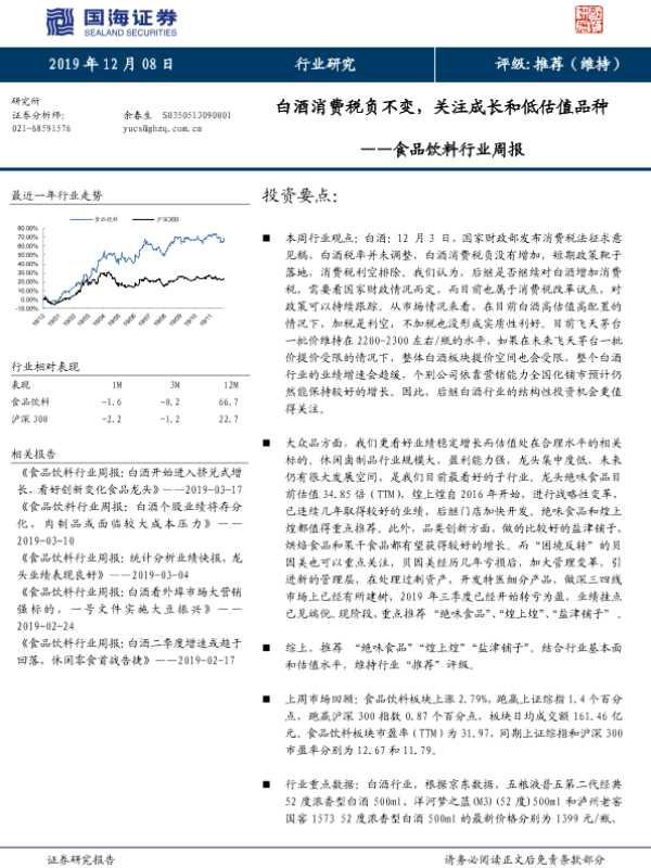 【国海证券】【20191208】20191208-国海证券-食品饮料行业周报:白酒消费税负不变,关注成长和低估值品种-21页 行业研究