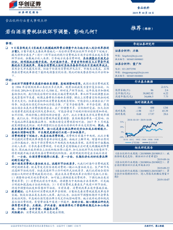 【华创证券】【20191010】食品饮料行业重大事项点评:若白酒消费税征收环节调整,影响几何?-4页 行业研究