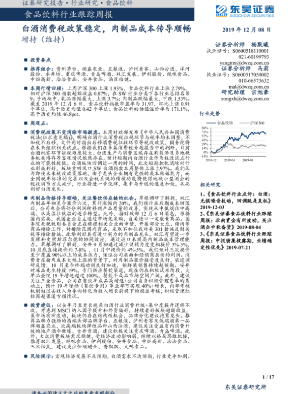 【东吴证券】【20191208】食品饮料行业跟踪周报:白酒消费税政策稳定,肉制品成本传导顺畅-17页 行业研究