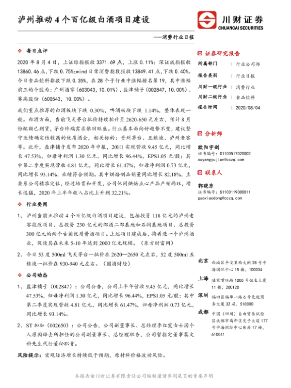【川财证券】【20200804】消费行业日报:泸州推动4个百亿级白酒项目建设-3页 证券期货研究报告