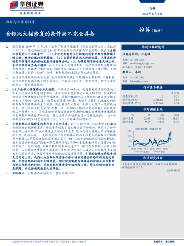 【华创证券】【20200801】20200801-华创证券-白银行业跟踪报告:金银比大幅修复的条件尚不完全具备-9页 行业研究