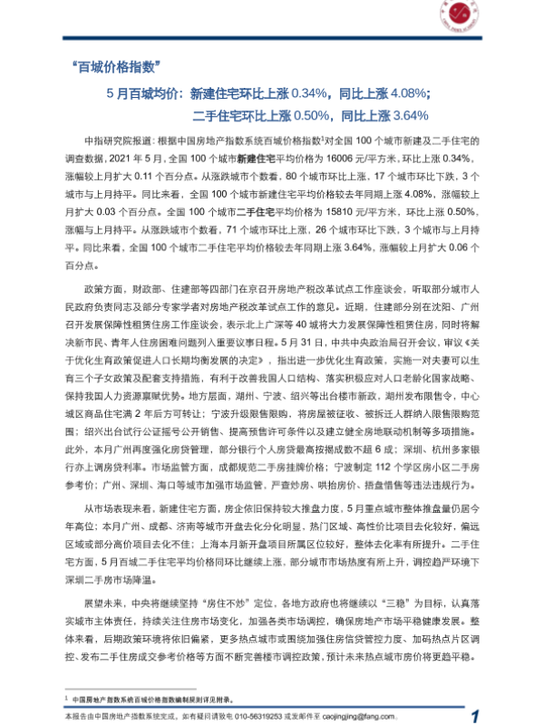 【中国房地产指数系统】【202106】2021年5月中指百城价格指数报告-13页 行业研究