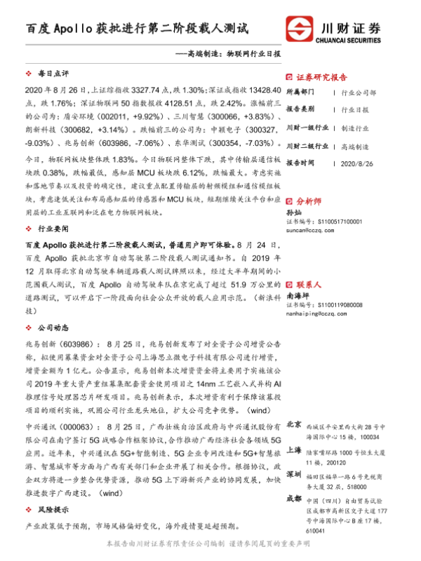 【川财证券】【20200826】高端制造:物联网行业日报:百度Apollo获批进行第二阶段载人测试-2页 证券期货研究报告