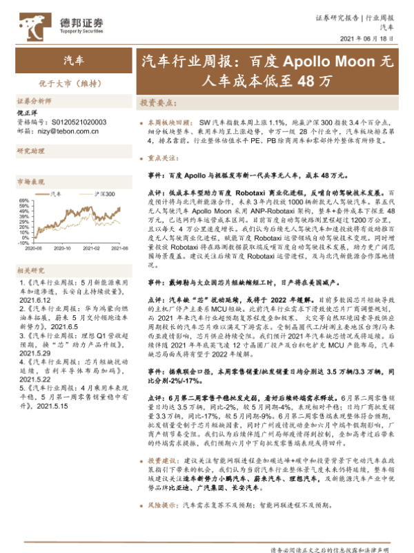 【德邦证券】【20210618】汽车行业周报:百度Apollo Moon无人车成本低至48万-14页 行业研究