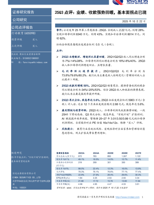 【财通证券】【202510】行动教育(605098)百校计划开启新篇章,三季报强劲反弹拐点已现-10页 证券期货研究报告