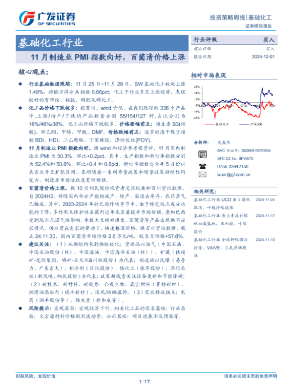 【广发证券】【20241201】20241201-广发证券-基础化工行业投资策略周报:11月制造业PMI指数向好,百菌清价格上涨-17页 行业研究