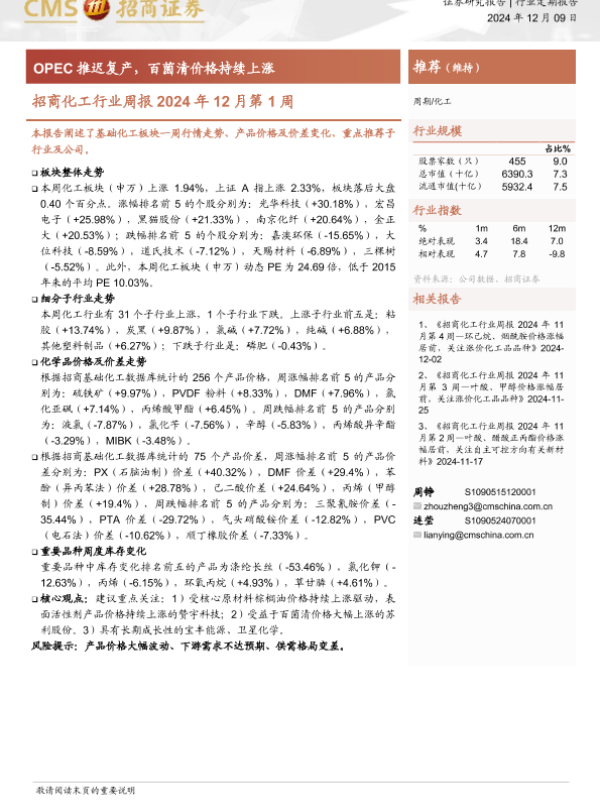 【海通证券】【20241209】招商化工行业周报2024年12月第1周:OPEC推迟复产,百菌清价格持续上涨-15页 行业研究
