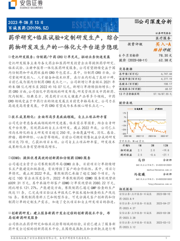 【安信证券】【20230813】百诚医药-301096.SZ-药学研究+临床试验+定制研发生产,综合药物研发及生产的一体化大平台逐步隐现-25页 行业研究