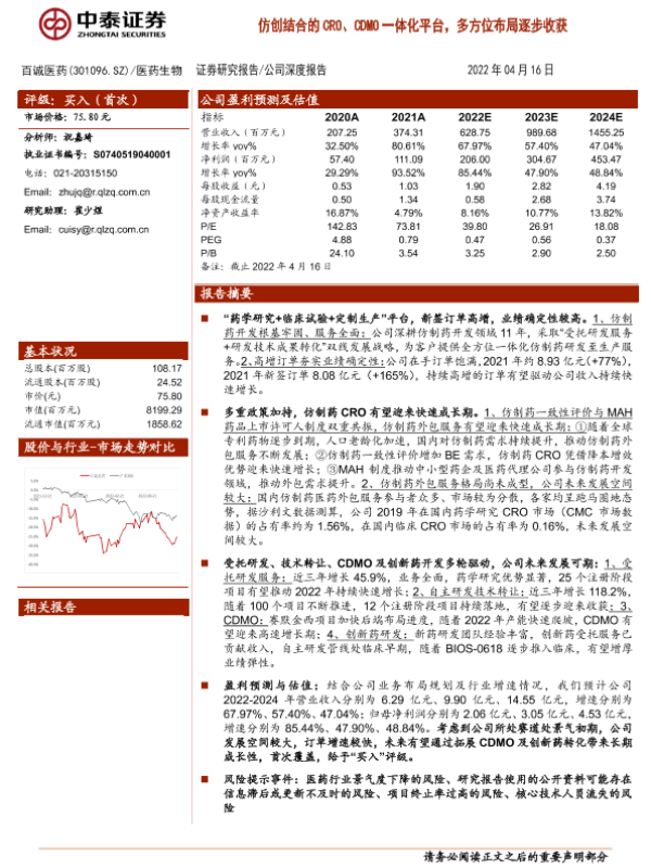 【中泰证券】【20220416】仿创结合的CRO、CDMO一体化平台,多方位布局逐步收获-24页 行业研究