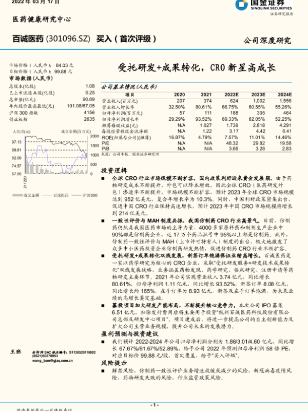 【国金证券】【20220317】百诚医药-301096.SZ-受托研发+成果转化,CRO新星高成长-23页 行业研究