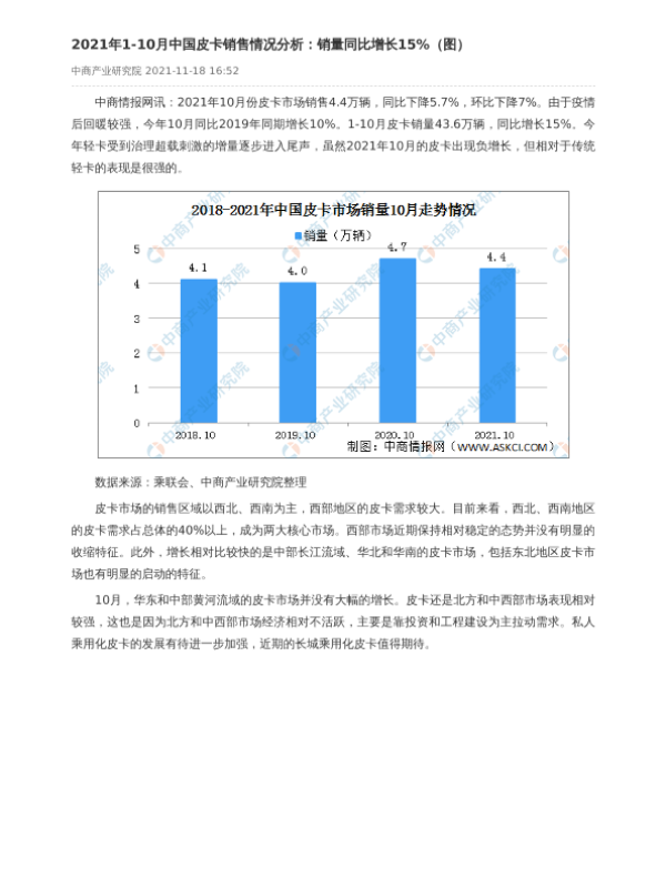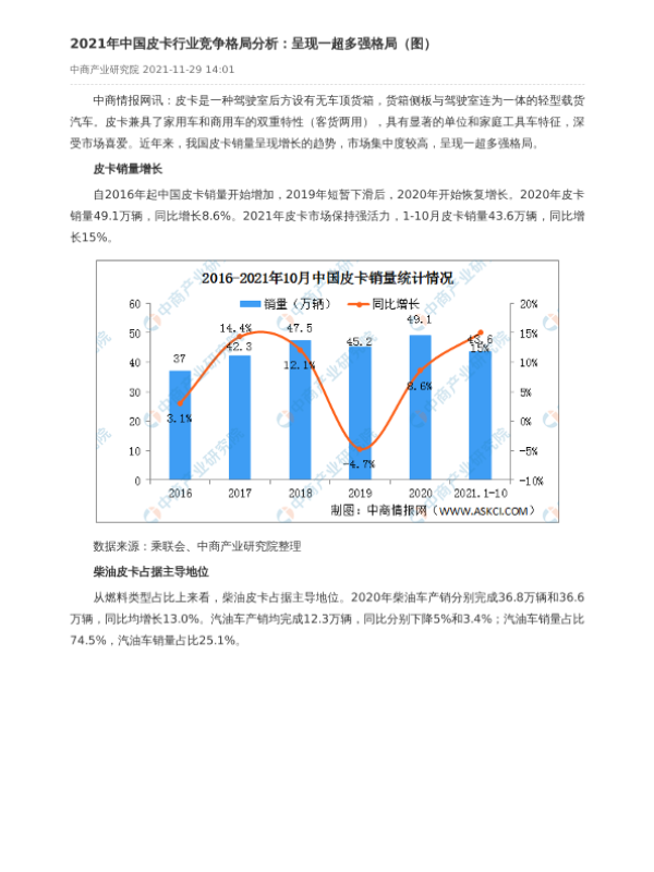 【中商产业研究院】【20211118】2021年1-10月中国皮卡销售情况分析-2页 市场调研