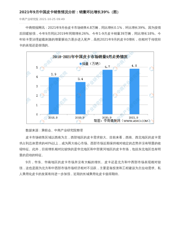 【中商产业研究院】【20211025】2021年9月中国皮卡销售情况分析:销量环比增长39%-2页 市场调研