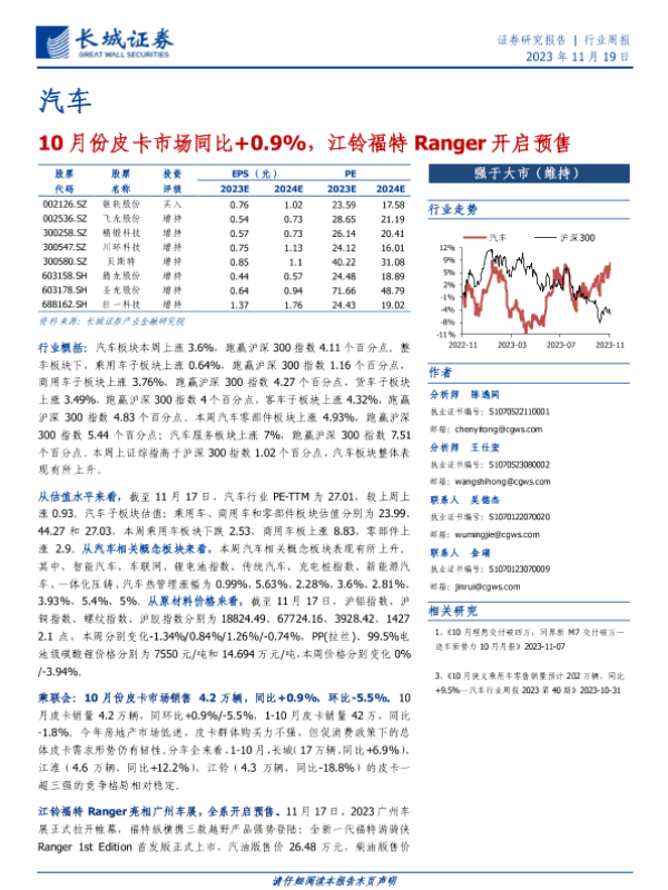 【长城证券】【20231119】20231119-长城证券-汽车行业周报:10月份皮卡市场同比+0.9%,江铃福特Ranger开启预售-12页 行业研究