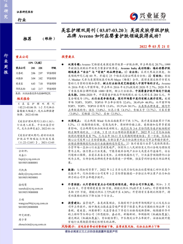 【兴业证券】【20220321】美容护理双周刊:美国皮肤学级护肤品牌Aveeno如何在婴童护肤领域获得成功?-19页 行业研究