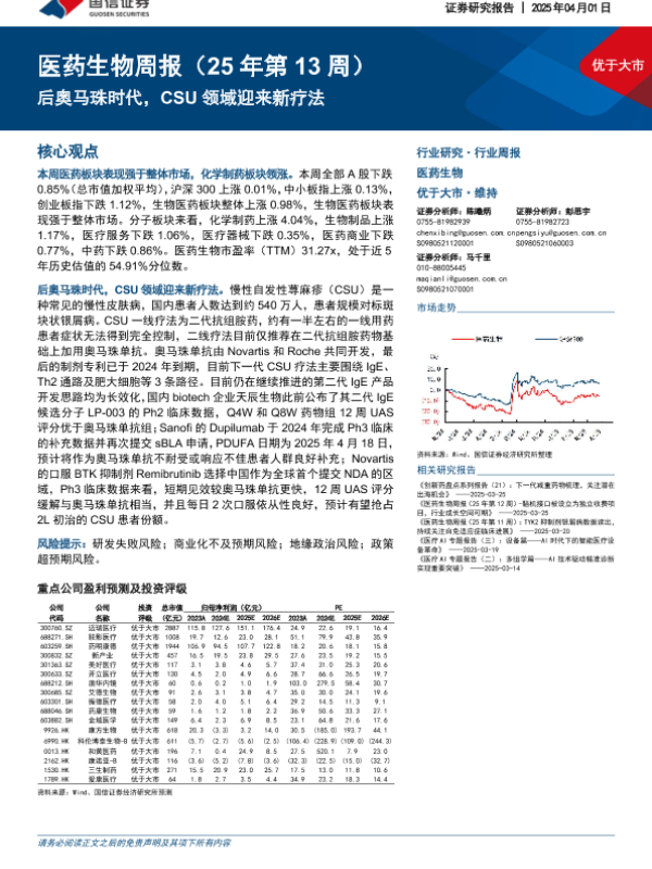 【国信证券】【20250401】20250401-国信证券-医药生物周报(25年第13周):后奥马珠时代,CSU领域迎来新疗法-19页 行业研究