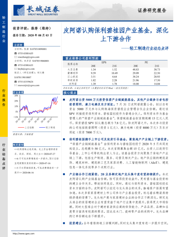 【长城证券】【20200803】轻工制造行业动态点评:皮阿诺认购保利碧桂园产业基金,深化上下游合作-3页 行业研究