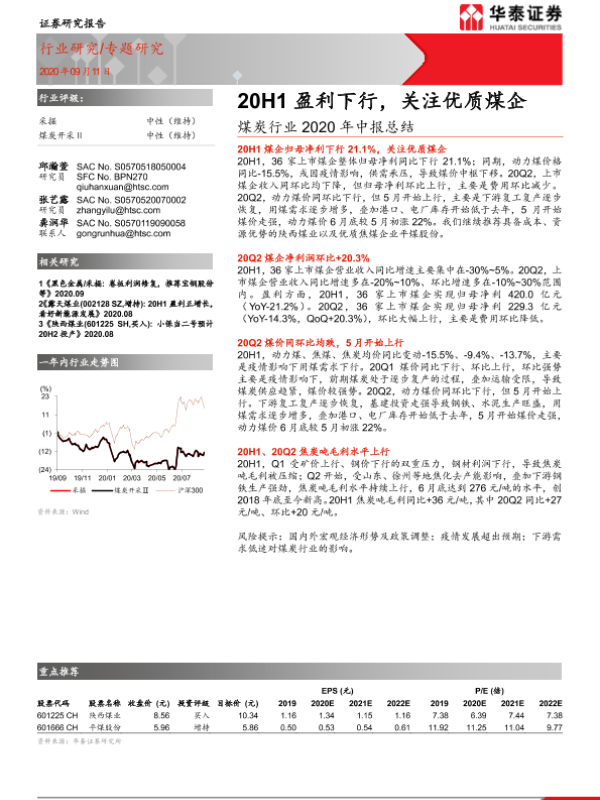 【华泰证券】【20200911】煤炭行业2020年中报总结:20H1盈利下行,关注优质煤企-12页 行业研究