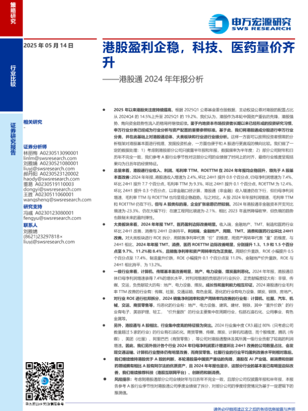 【申万宏源】【20250514】港股通2024年年报分析:港股盈利企稳,科技、医药量价齐升-12页 证券期货研究报告