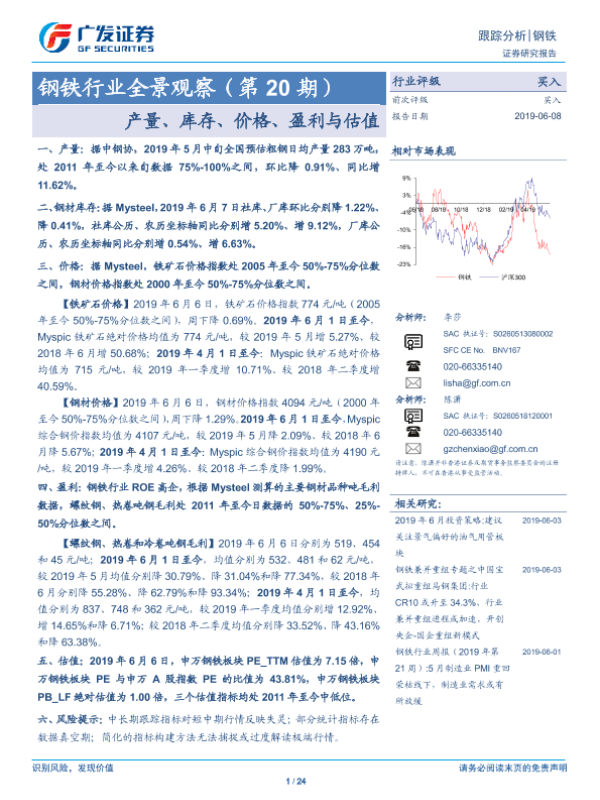 【广发证券】【20190608】20190608-广发证券-钢铁行业全景观察(第20期):产量、库存、价格、盈利与估值-24页 行业研究