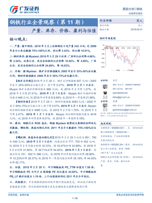 【广发证券】【20190331】20190331-广发证券-钢铁行业全景观察(第11期):产量、库存、价格、盈利与估值-24页 行业研究