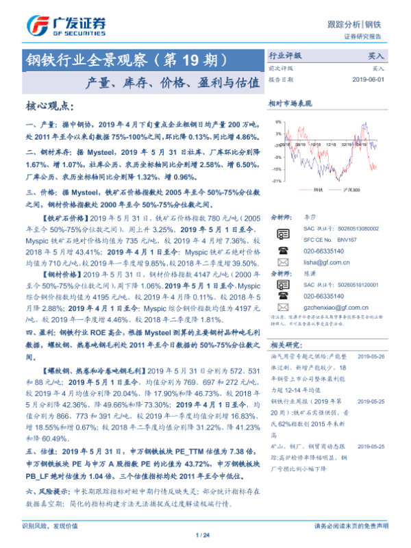 【广发证券】【20190601】20190601-广发证券-钢铁行业全景观察(第19期):产量、库存、价格、盈利与估值-24页 行业研究