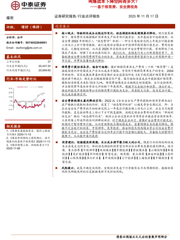 【中泰证券】【202511】吨煤成本下降空间有多大?——基于维简费、安全费视角-7页 证券期货研究报告